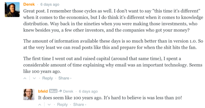 Exactly. As it happens, just last night I wrote a comment (screen cap below) on Brad Feld’s blog about how email is only about twenty years old in terms of mass adoption. I feel fortunate to have lived to see the evolution of communications and am excited for what lies ahead. Not just for the sake of the technology, but also for how it empowers us.